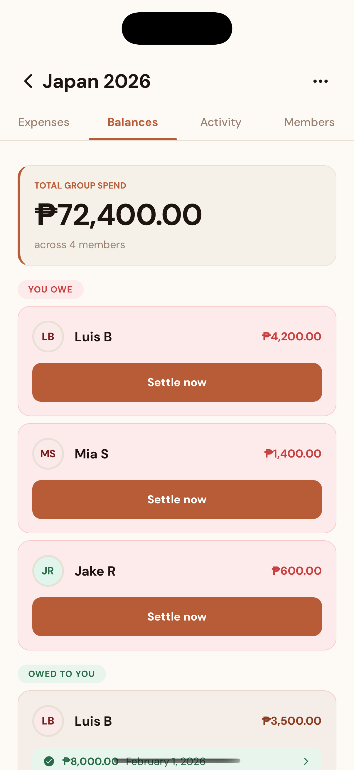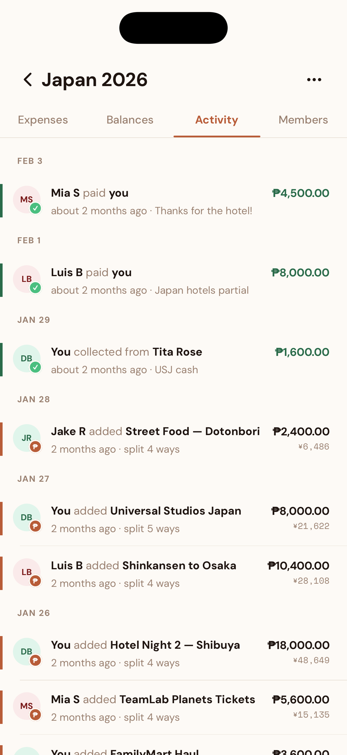 Guest members came from a real gap. Not everyone on a trip has the app — or wants to install one. Tita Rose joined the Japan group, paid for the accommodation in cash, and had no interest in downloading anything. The old version had no way to track her share. Now you can add anyone as a guest. Their debts are tracked, their name shows up in the splits, and if they ever sign up, they can claim their full history. It makes Kaya work for the whole group — including the ones who haven't downloaded it yet.
