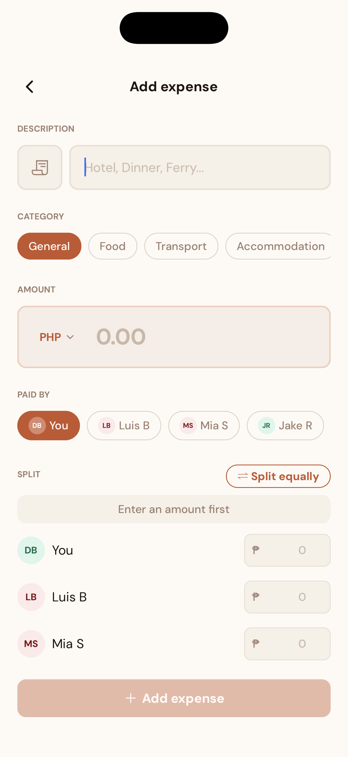 The hard part isn't the form — it's the split math. When you divide an amount equally, you almost always get a remainder of a few centavos. The app has to decide who gets it. Eventually I settled on just assigning it to the first person in the list. One line of logic that took a surprisingly long time to settle on.
